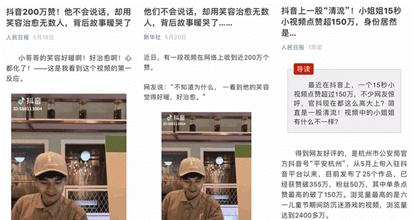 同期,抖音平台也涌现了许多正能量案例。其中,一个蛋糕店聋哑小哥哥的200万赞视频,相继获得人民日报、新华社点赞。6月5日,人民日报微信还点赞杭州市公安局官方抖音号“平安杭州”。