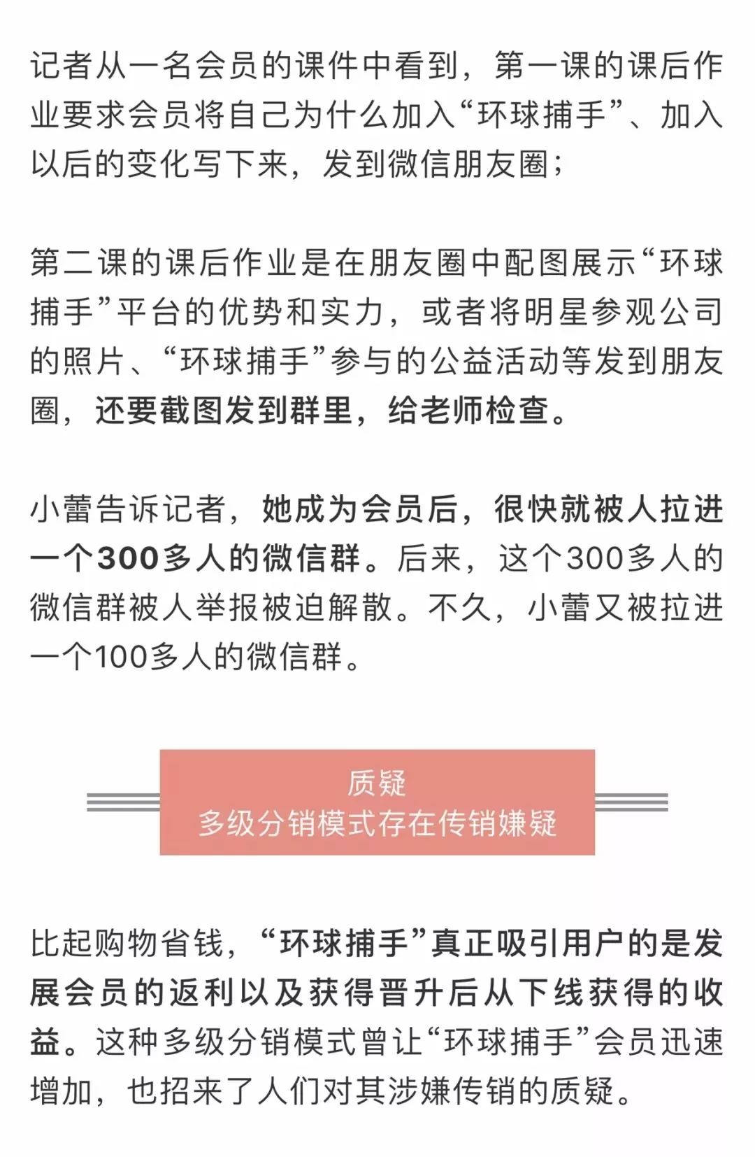 会员登录“环球捕手”APP后,里面有“商学院”,分“新人手册”“高手进阶”“捕手风采”三个板块,分阶段教会员如何营销。不少新晋会员往往会被老会员拉入微信群中,群里面会讲课,课后还会布置作业。
