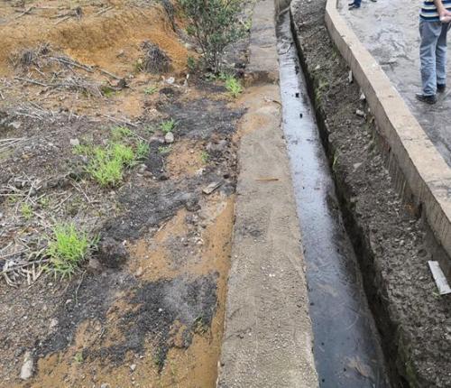 厂区没有建设初期雨水收集系统。现场检查时正值雨后,地面散落的含重金属废渣、粉尘经雨水冲刷进入雨水沟,最终汇入厂区低洼处。但由于收集池容积小,大量雨水混着含有重金属的污水溢流至厂区道路,厂区污水横流。