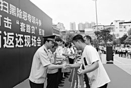 6月29日17时,运城市公安局盐湖分局在盐湖会堂广场,就运城市扫黑除恶专项斗争中盐湖区打击“套路贷”犯罪中的部分涉案车辆进行返还,现场会首批返还受害人车辆30辆。图为给受害者发放车辆钥匙。 本报记者胡增春摄