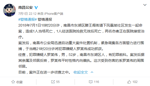 7月1日18时20分许,南昌市东湖区滕王阁街道下凤凰坡社区发生一起命案,造成1人当场死亡,1人经送医院抢救无效后死亡,两名伤者正在医院接受治疗。