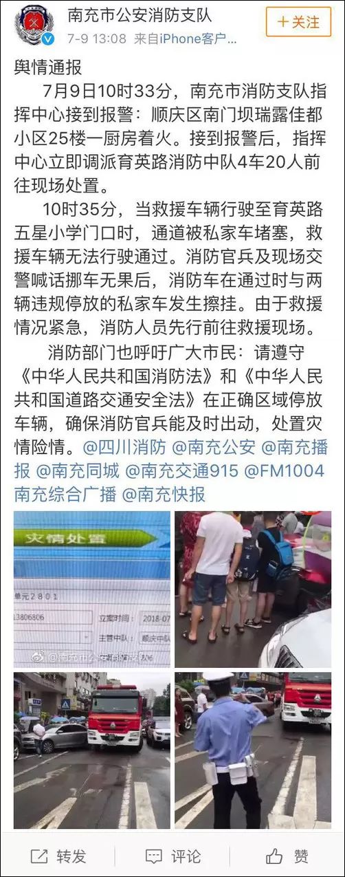 然而当消防车途经五星小学门口时,因消防通道被私家车辆堵塞,一时无法通行,为保群众生命财产安全,情急之下消防车从私家车中 “撞”出一条生命通道。