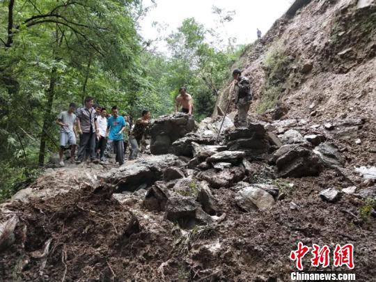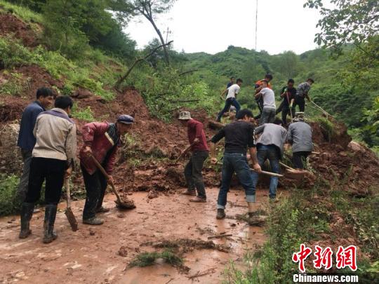 图为甘肃陇南市武都区民众抢修通村道路。 李腊梅 摄