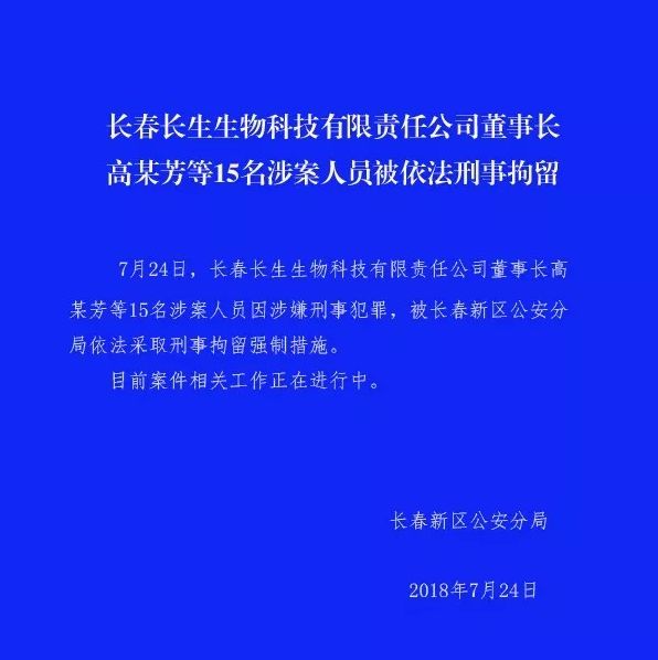 7月24日晚8时,长春新区公安分局发布最新消息称,长春长生生物科技有限责任公司董事长高某芳等15名涉案人员因涉嫌刑事犯罪,被长春新区公安分局依法采取刑事拘留强制措施。目前案件相关工作正在进行中。