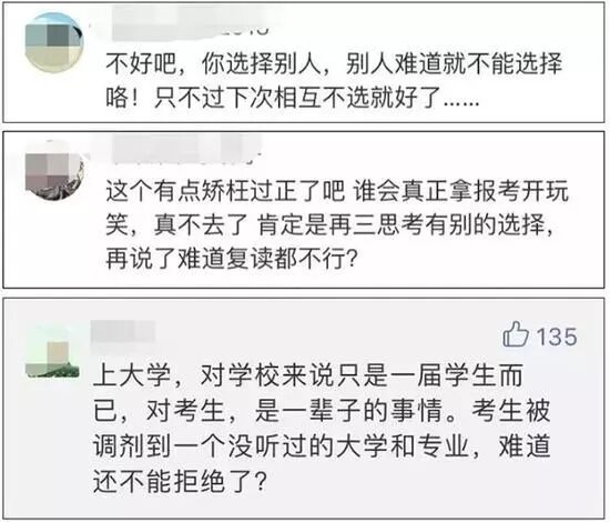 但也有媒体认为这事儿真的不能怪考生:问题不在考生,在学校。因为学校没有权力来根据历年数据进行超额录取。