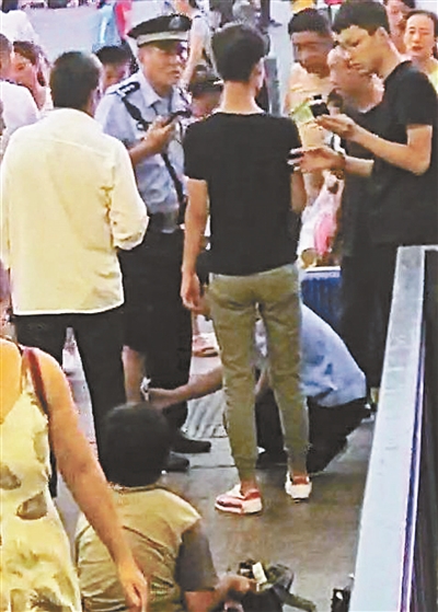 暑运以来,北京站旅客增多,铁警联合城管清理不法游商。在7月28日的检查中,一名向游客兜售矿泉水、马扎的女性商贩看到执勤民警后坐在地上耍赖,并从背包里拿出剪刀宣称不让卖东西就自残。民警欲夺下剪刀,女子反抗并将民警的小腿扎伤。经诊断,民警小腿切割伤口长3.5厘米,深2厘米,肌肉中的一条小动脉血管被切断。涉事女子涉嫌妨碍公务被北京铁路警方刑事拘留。