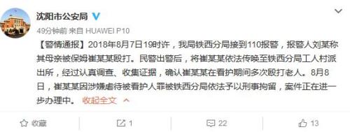 通报称,2018年8月7日19时许,辽宁省沈阳市公安局铁西分局接到110报警,报警人刘某称其母亲被保姆崔某某殴打。民警出警后,将崔某某依法传唤至铁西分局工人村派出所,经过认真调查、收集证据,确认崔某某在看护期间多次殴打老人。