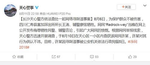 中新网8月12日电 据湖南省长沙市公安局天心分局官方微博消息,日前,一名网民在网上公开发布侮辱四川仁寿牺牲民警、辅警言论,被公安机关依法行政拘留5日。
