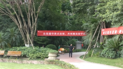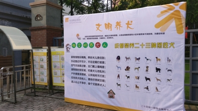 14日下午,记者又来到华润二十四城一期。刚进1号门,就看到工作人员在摆放《成都市养犬管理条例》展板。左手边的出口处,则摆放了大幅的“文明养犬”宣传展板,上面还公布了成都市禁养犬种。小区内悬挂了多条横幅,上面写着“自觉遵守养犬法规”、“禁养烈性犬”、“文明养犬”等字样。不过,展板上禁养犬种的数目和种类与官方公布的并不一致。