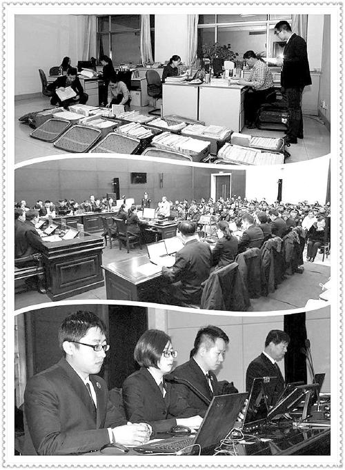 上:卷宗装满12个行李箱;中:案件庭审现场;下:检察官出庭支持公诉