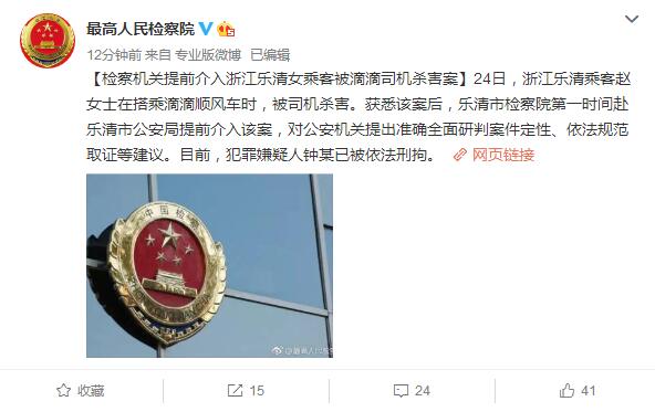 中新网8月25日电 据最高人民检察院微博消息:24日,浙江乐清乘客赵女士在搭乘滴滴顺风车时,被司机杀害。获悉该案后,乐清市检察院第一时间赴乐清市公安局提前介入该案,对公安机关提出准确全面研判案件定性、依法规范取证等建议。