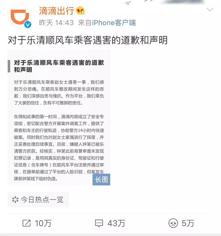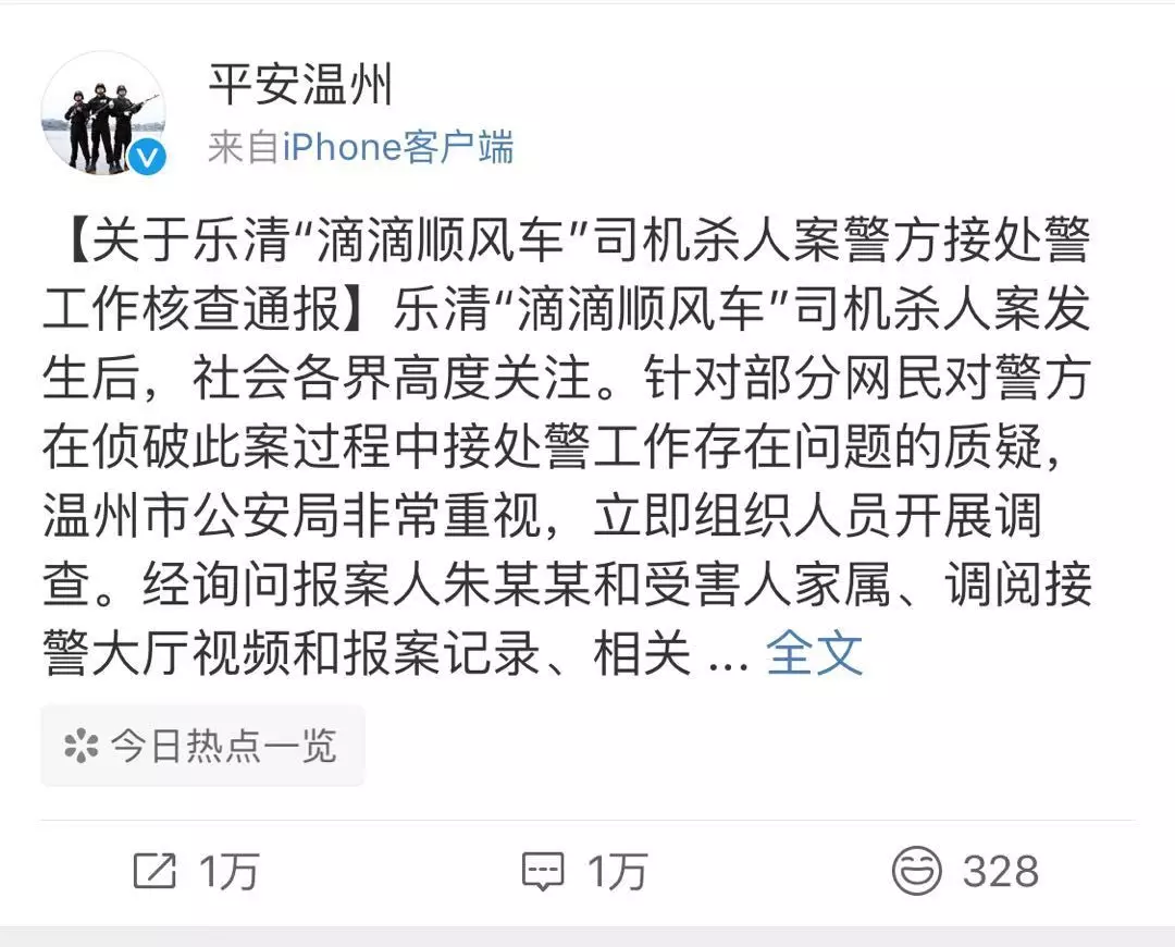 @滴滴出行 在微博上发布“对于乐清顺风车乘客遇害的道歉和声明”。其中,证实了客服回馈不及时、之前一天同一司机遭投诉未处理等网络传闻,同时,承诺未来平台上发生的所有刑事案件,滴滴都将给予三倍赔偿等。