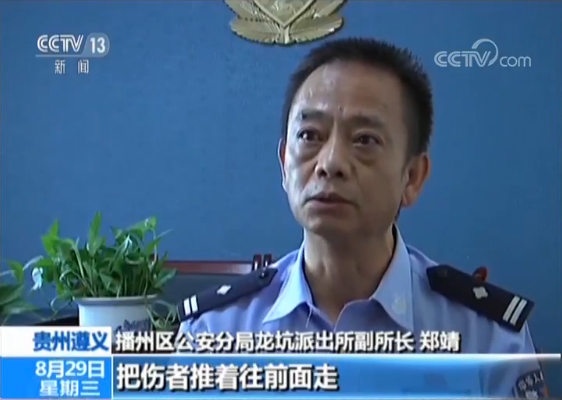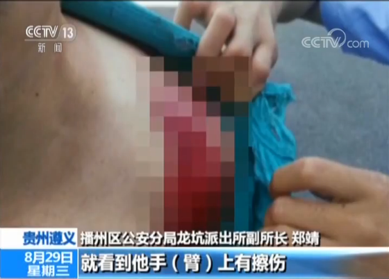 播州区公安分局龙坑派出所副所长 郑靖:我们到了现场之后就看到伤者躺在地上,就看到他手臂上有擦伤,肩胛骨有大量挫伤。