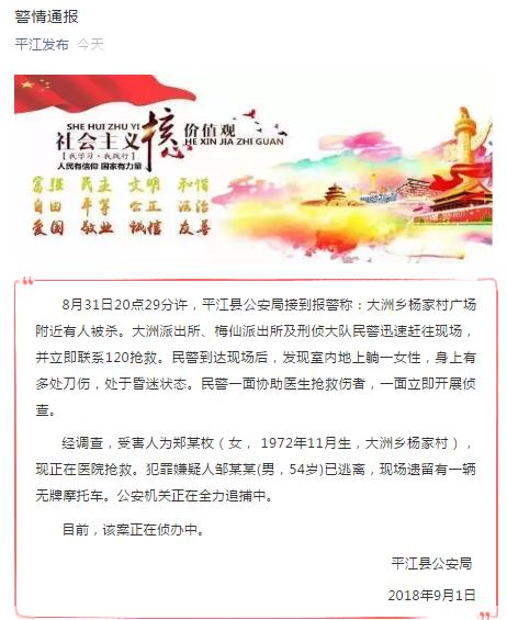 中新网9月1日电 据湖南省平江县委宣传部“平江发布”微信公众号消息,民警接到报警称大洲乡杨家村广场附近有人被杀,到达现场发现室内地上躺一女性,身上有多处刀伤,处于昏迷状态。受害人现在医院抢救,犯罪嫌疑人已逃离,公安机关正在全力追捕中。