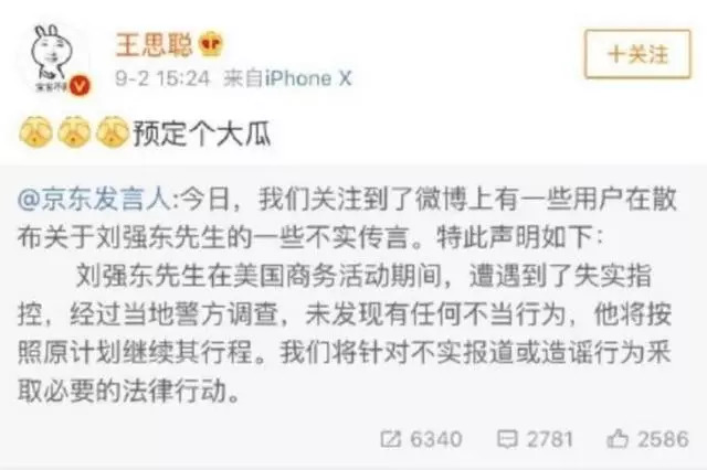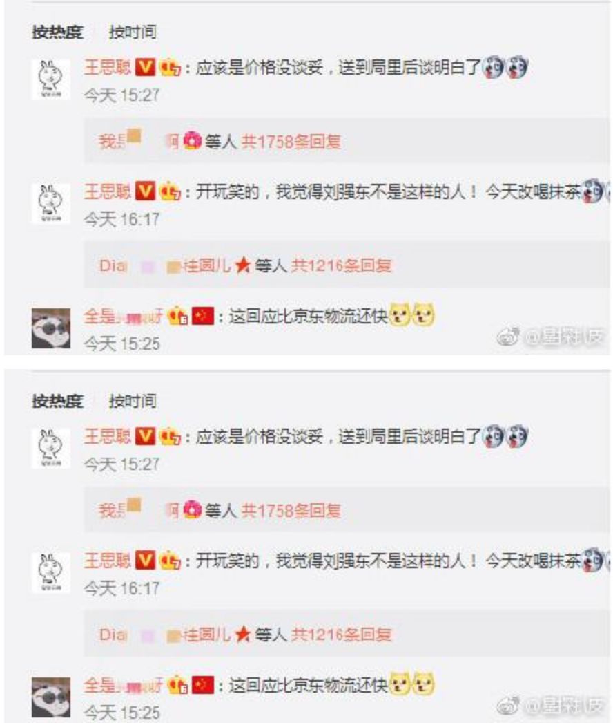而作为娱乐圈纪检委的王思聪一向快人快语,凭借一路手撕娱乐圈,让整个娱乐圈中很多明星都被炮轰过。这次王思聪不单单撕娱乐圈,商界同样撕。王思聪第一时间转发了京东公司的微博表示关注,还称是“价格没谈妥”。