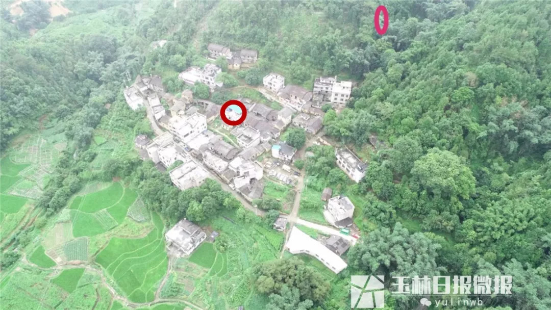 警方无人机搜寻图片,下红圈为小娇家,上红圈为失踪小娇发现地点。
