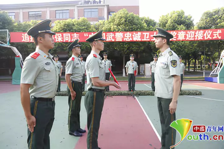 李峰同志向李保保生前战友转交“中国武警忠诚卫士”奖章。蒋鑫 摄