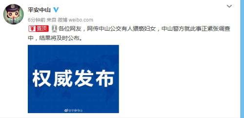中新网9月26日电 广东省中山市公安局今日在官方微通报,网传中山公交有人猥亵妇女,中山警方就此事正紧张调查中,结果将及时公布。