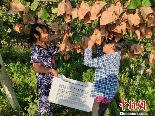 在新邵县潭府乡玉辉农林公司猕猴桃基地,一个个套着纸袋的猕猴桃缀满枝头。 王昊昊 摄