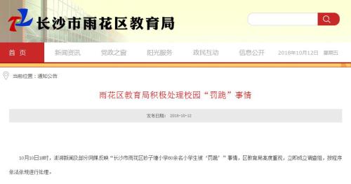 中新网10月12日电 针对“长沙市雨花区砂子塘小学60余名小学生被‘罚跪’”一事,湖南省长沙市雨花区教育局12日发布通报称,区教育局高度重视,立即成立调查组,按程序依法依规进行处理。