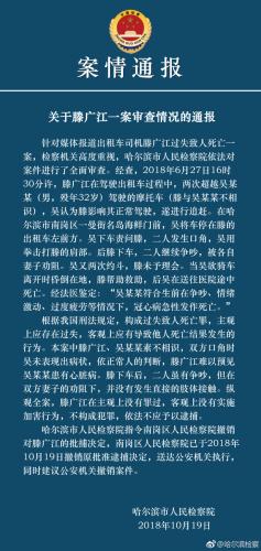通报中称,经查,2018年6月27日16时30分许,滕广江在驾驶出租车过程中,两次超越吴某某(男,殁年32岁)驾驶的摩托车(滕与吴某某不相识),吴认为滕影响其正常驾驶,遂进行追赶。在哈尔滨市南岗区一曼街名岛海鲜门前,吴将车停在滕的出租车左前方。吴下车责问滕,二人发生口角,吴用拳击打滕的肩部。后滕下车,二人继续争吵,被各自妻子劝阻。吴又两次约斗,滕未予理会。当吴欲骑车离开时昏倒在地,滕帮助救助,后吴在送往医院途中死亡。经法医鉴定:“吴某某符合生前在争吵、情绪激动、过度疲劳等情况下,冠心病急性发作死亡。”