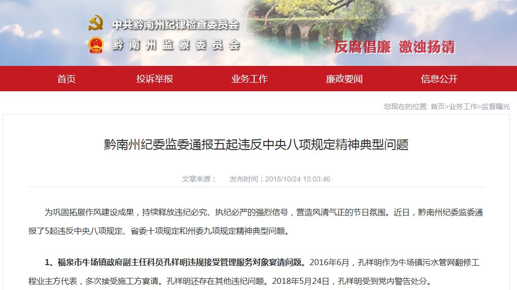 1、福泉市牛场镇政府副主任科员孔祥明违规接受管理服务对象宴请问题。2016年6月,孔祥明作为牛场镇污水管网翻修工程业主方代表,多次接受施工方宴请。孔祥明还存在其他违纪问题。2018年5月24日,孔祥明受到党内警告处分。