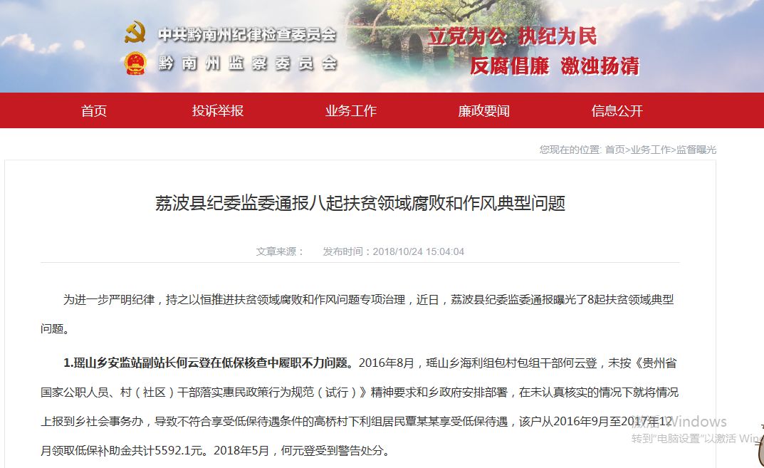 为进一步严明纪律,持之以恒推进扶贫领域腐败和作风问题专项治理,近日,荔波县纪委监委通报曝光了8起扶贫领域典型问题。