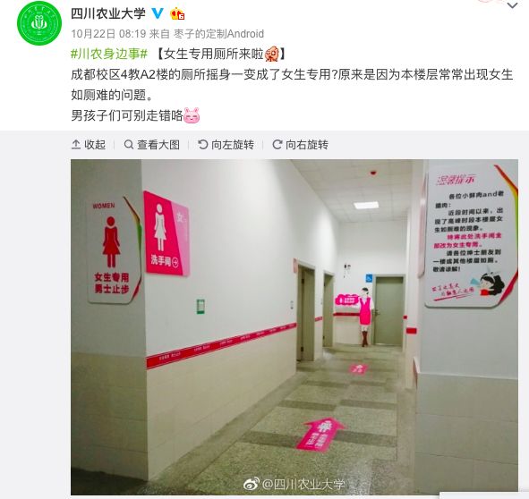 10月22日,@四川农业大学 发布了一条“女生专用厕所”的微博…