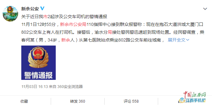 中国江西网讯 记者郑周贇报道:自从重庆公交车因司乘纠纷坠江后,公交车安全问题引起了广泛关注。11月4日,中国江西网记者注意到,新余公安通报了2起涉及公交车司机的警情。