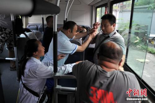 资料图:2014年7月16日下午,北京公交总队718路公交车总站举行“反恐演习”。图为公交车司机、售票员和乘客一同制服“嫌疑人”。 中新网记者 金硕 摄