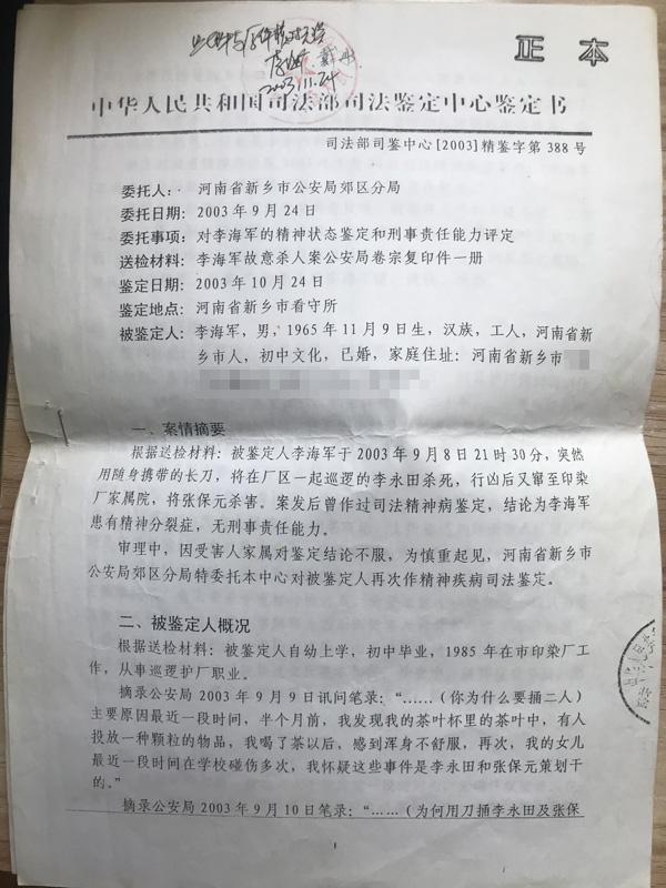 11月19日,司法部司法鉴定中心又出具了关于李海军精神状态和刑事责任能力的鉴定书,鉴定李海军患有精神分裂症,案发时及目前均为发病期。