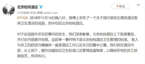 对于视频中涉及的事件的发生,北京柏悦酒店表示深表歉意,酒店上下极度重视,并已在内部展开彻查。