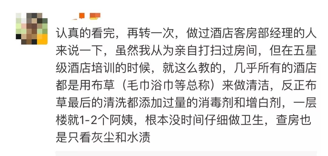 还有网友爆料称,五星级酒店都是一层就1-2个打扫阿姨,根本没时间仔细做卫生,查房也只看灰尘和水渍。