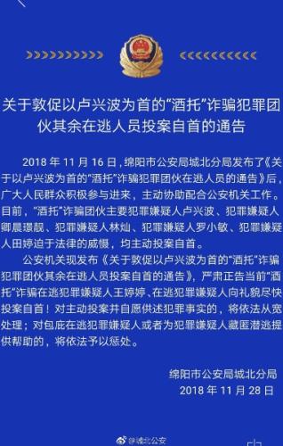 警方通告称,2018年11月16日,绵阳市公安局城北分局发布了《关于检举以犯罪嫌疑人卢兴波为首的“酒托”诈骗犯罪团伙在逃人员的通告》后,广大人民群众积极参与进来,主动协助配合公安机关工作。目前,“酒托”诈骗团伙主要犯罪嫌疑人卢兴波、犯罪嫌疑人卿晨璟靓、犯罪嫌疑人林灿、犯罪嫌疑人罗小敏、犯罪嫌疑人田婷迫于法律的威慑,均主动投案自首。