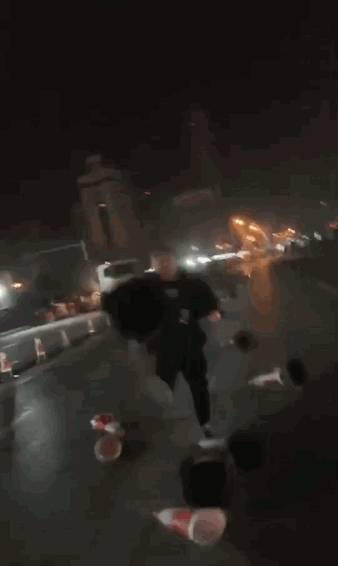 将摆放在路上隔离道路的锥形桶一一破坏......