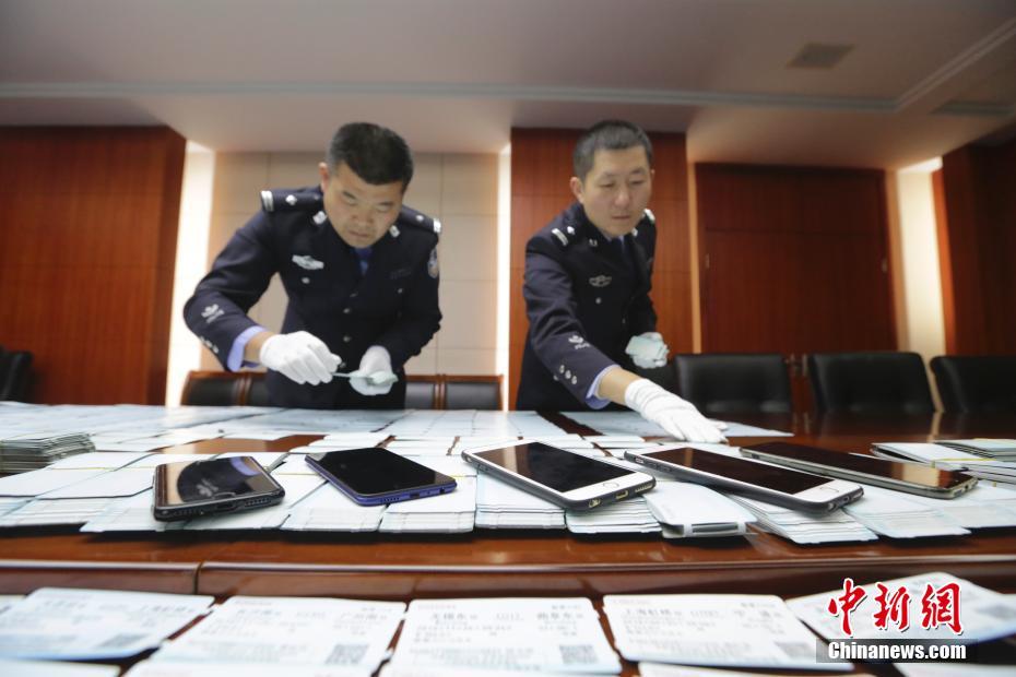 12月8日,南京铁路警察清点收缴的假票。12月7日,南京铁路警方雷霆出击,捣毁了隐藏在浙江省嘉善县某小区的一处家族式制售假火车票窝点,抓获涉嫌伪造、倒卖伪造有价票证罪的犯罪嫌疑4人,当场缴获假火车票181张、火车票半成品6378张、作案手机5部、电脑4台,打印机3台。中新社发 莫静 摄