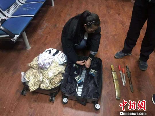 女子行李箱内藏四把长刀乘火车被拘留。 张海邦 摄