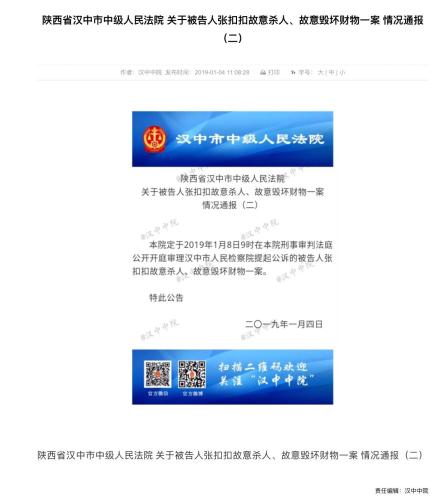 据汉中市中级人民法院1月4日通报称,汉中市中级人民法院定于2019年1月8日在该院刑事审判法庭公开开庭审理汉中市人民检察院提起公诉的被告人张扣扣故意杀人、故意损毁财物一案。