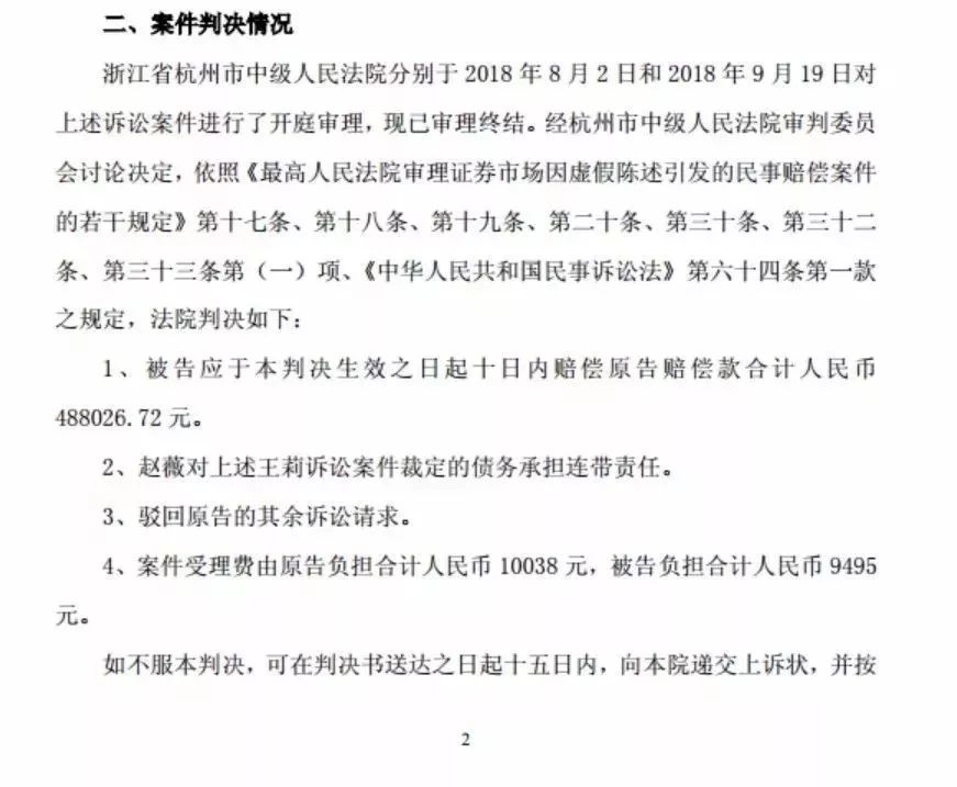 浙江裕丰律师事务所厉健代理的股民王女士的证券虚假陈述案,在去年9月19日开庭时当庭申请追加赵薇为被告。杭州中院一审判决,祥源文化支付原告王女士赔偿款、利息合计5.45万元,赵薇需对上述债务承担连带责任。