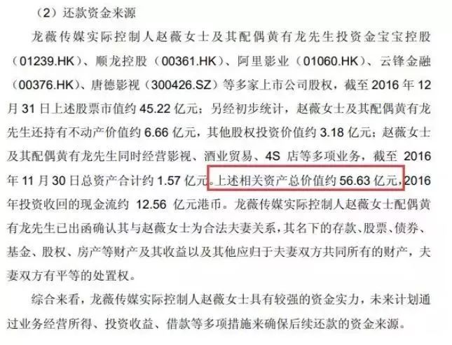 根据万家文化2017年1月公告中透露的信息,赵薇及其丈夫黄有龙持有酒庄、房产、上市公司股票等,截至2016年12月31日,上述相关资产总价值约56.63亿元人民币。