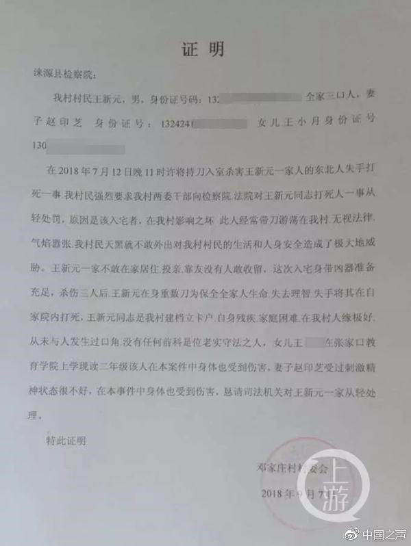 有媒体援引一份印有涞源县邓庄村村委会印章的证明文件中提到,“王磊此前经常带刀在村中游荡”。邓庄村村民在接受媒体采访时表示: