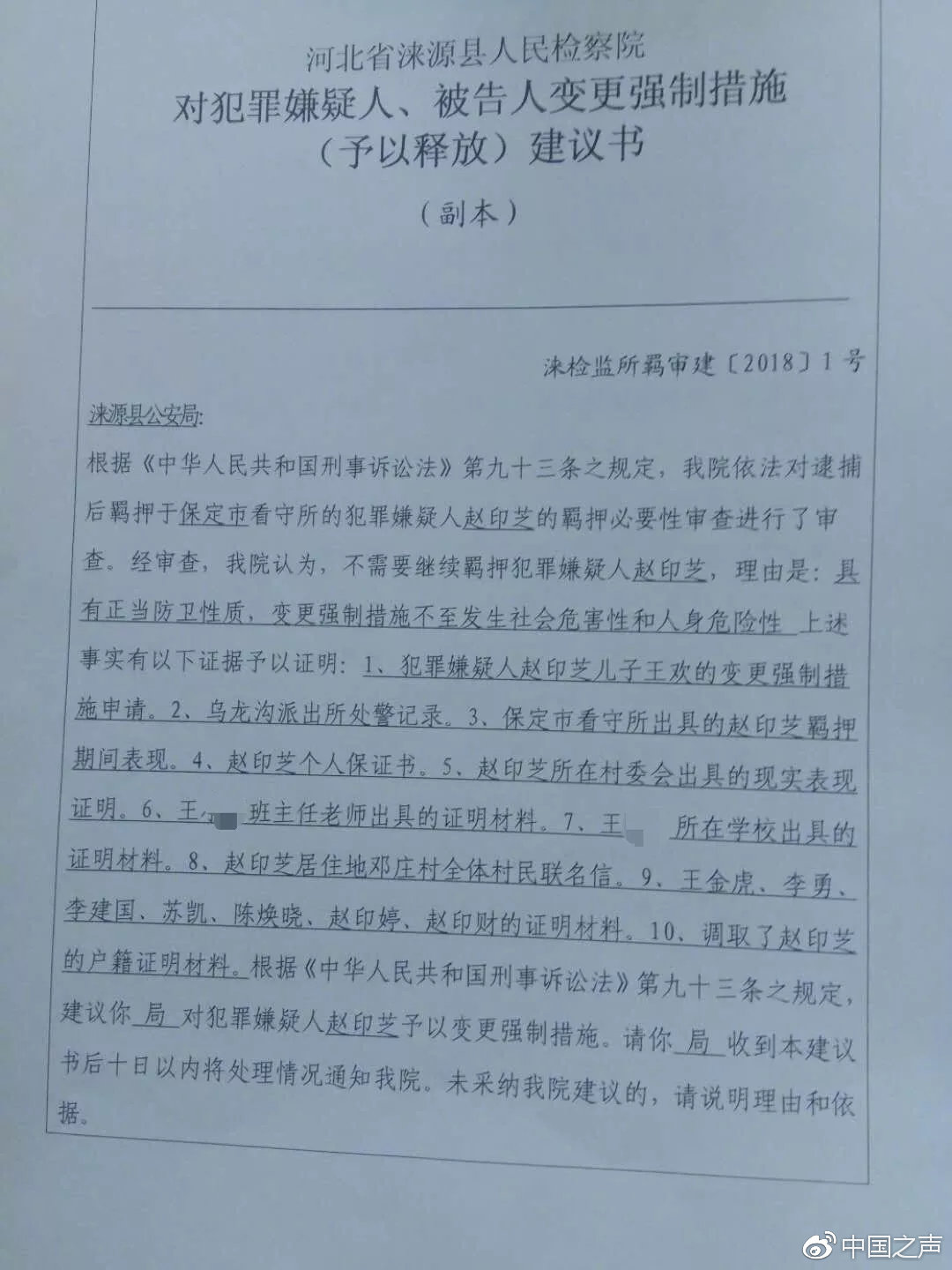 涞源县人民检察院向涞源县公安局发出的《对犯罪嫌疑人、被告人变更强制措施建议书》中称,赵印芝主观上没有杀人的故意,客观上造成王磊的死亡是属于刑法规定的正当防卫性质。小月一家长期遭受不法侵害,一家人无法正常生产生活,建议对赵印芝变更强制措施。但该建议未被涞源县公安局采纳。