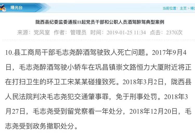 1月25日,甘肃陇西县纪委监委通过官方网站通报11起党员干部和公职人员酒驾醉驾典型案例,其中第十起是“县工商局干部毛志尧醉酒驾驶致人死亡问题”。