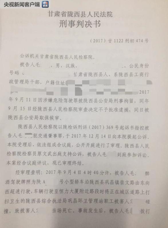 甘肃省陇西县人民法院向记者出示了这一案件的刑事判决书,判决书上显示:经陇西县人民法院审理查明:2017年9月4日4时40分许,被告人毛某某醉酒驾驶牌照为陕A×××××号小型轿车沿陇西县巩某崇文路由东向西超速行驶,车辆行驶至恒力大厦附近路段时将正在城区道路上打扫卫生的陇西县综合执法局巩昌环卫管理站职工被害人宋某碰撞,致被害人宋某当场死亡。事故发生后,被告人毛某某拨打110电话报警。经陇西县公安局交警大队道路交通事故责任认定,本起道路交通事故中被告人毛某某承担全部责任,被害人宋某无责任。经甘肃陇通司法鉴定所司法鉴定检验,被告人毛某某血液中检出乙醇,平均含量为268.15mg/100ml。经甘肃明源司法物证鉴定所鉴定,被害人宋某符合交通事故致创伤性休克死亡。