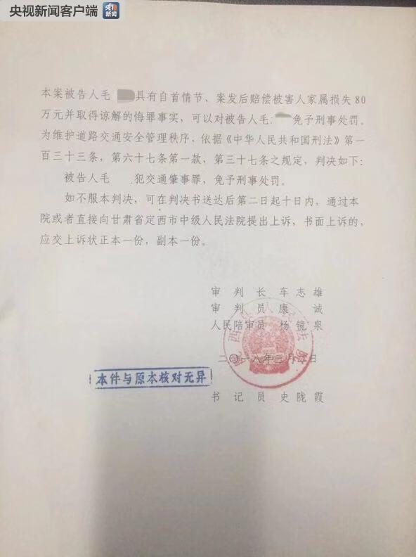 有网友质疑,干部醉驾致人死亡被判免于刑责是否妥当?对此,1月26日,陇西县人民法院通过其官方微信公号作出情况说明称,该院注意到该舆情后,立即按照相关工作要求启动了对被告人毛志尧交通肇事罪一案的专案评查。现评查工作正在进行,待评查结束后,该院将及时向社会各界公布评查结果。