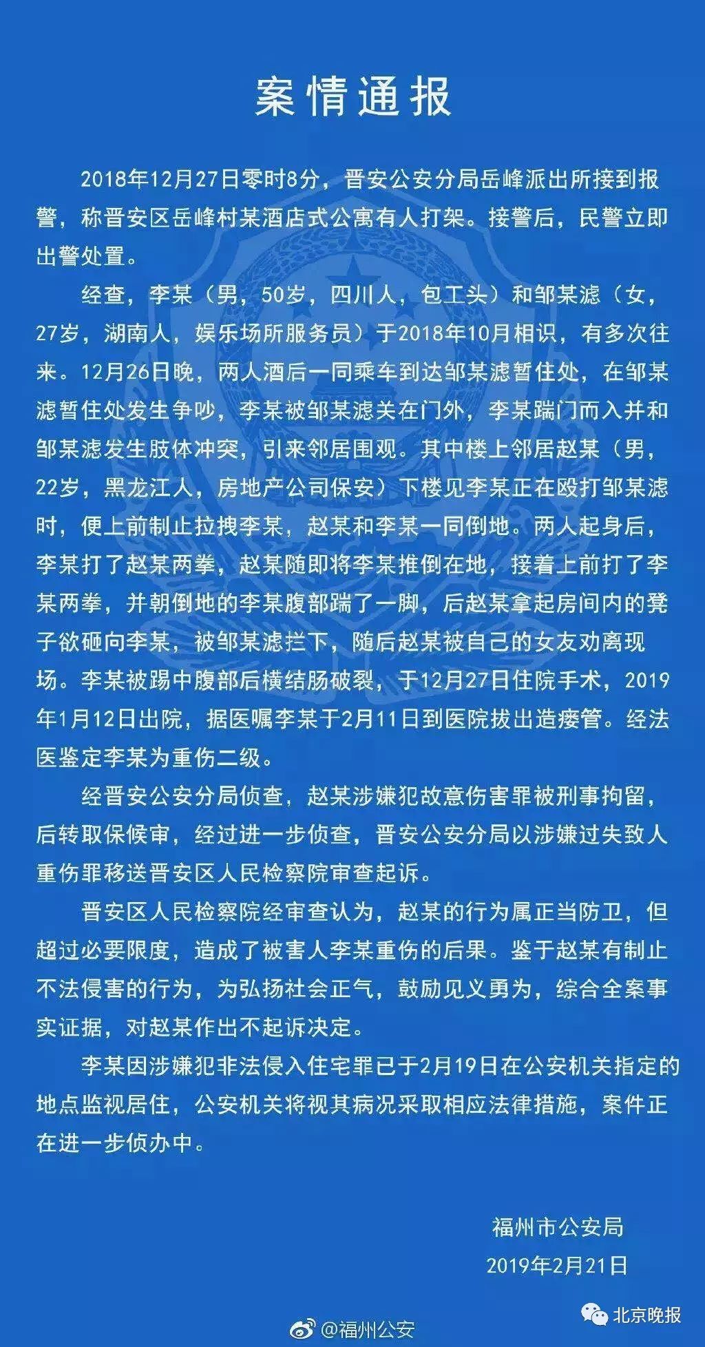 2月20日,福州市公安局晋安分局以过失致人重伤将赵宇移交晋安区人民检察院。