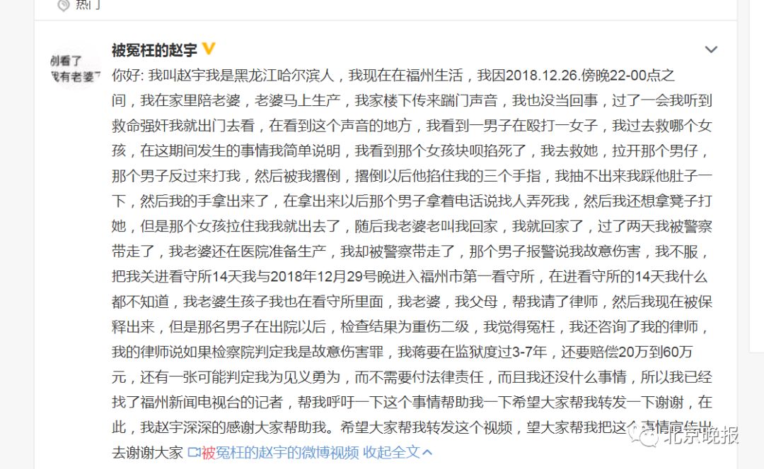 2019年2月17日,福州网友@被冤枉的赵宇 发微博称,2018年12月26日,自己见义勇帮助一位正在被侵害的女士脱离危险,结果被拘留了14天,接下来还可能受到刑事制裁。