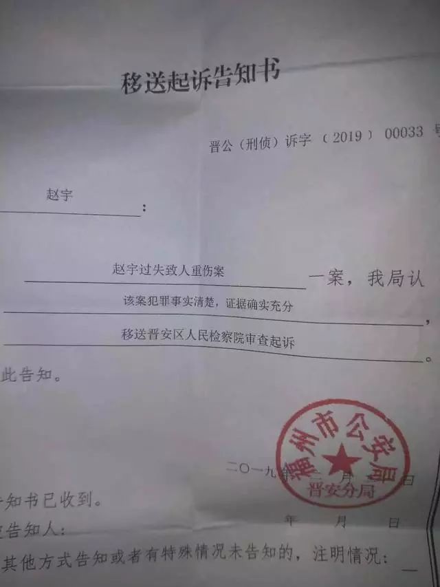 2019年2月20日,福州市公安局晋安分局以过失致人重伤将赵宇移交晋安区人民检察院