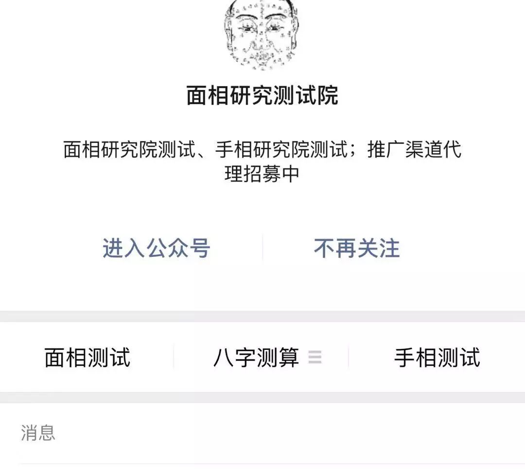 搜索后看到,有不少公众号内都提供这种“面相测试”的链接,但很多链接点开后都导向同一个测试平台。根据介绍,这款面相测试是由杭州算术科技有限公司开发,并在20日与该公司推广经理薛先生取得了联系。