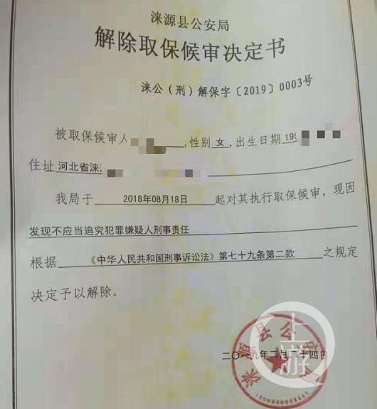 今年2月24日,此事有了最新进展。涞公(刑)解保字(2019)0003号文书载明,2018年8月18日,对小菲执行取保候审,现因发现不应当追究犯罪嫌疑人刑事责任,根据刑事诉讼法规定予以解除。